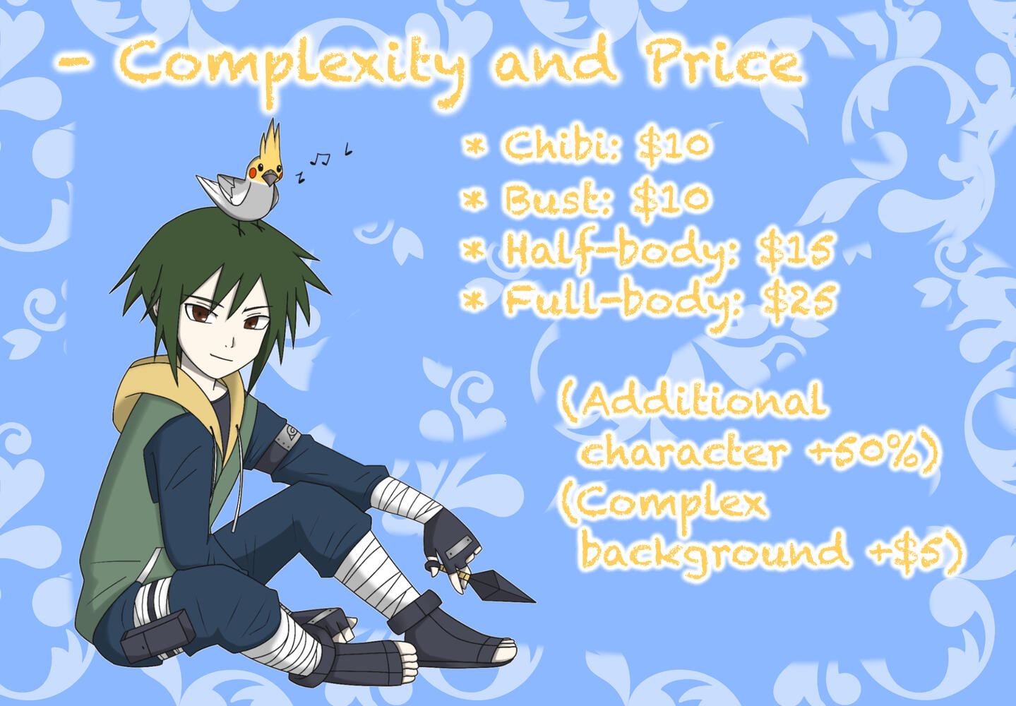 Welcome to my commission info page! Here you will see the prices depending on complexity, terms and service, and some examples of my work. If you have any questions, do let me know!Current slots available: (3/4)