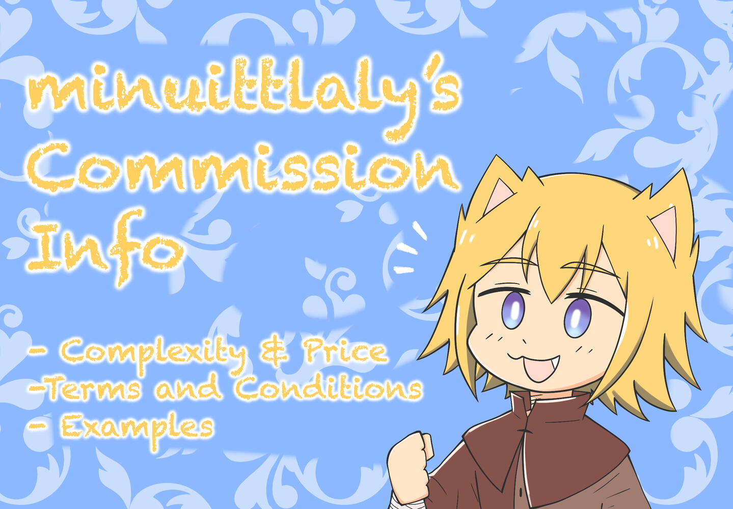 Welcome to my commission info page! Here you will see the prices depending on complexity, terms and service, and some examples of my work. If you have any questions, do let me know!Current slots available: (3/4)